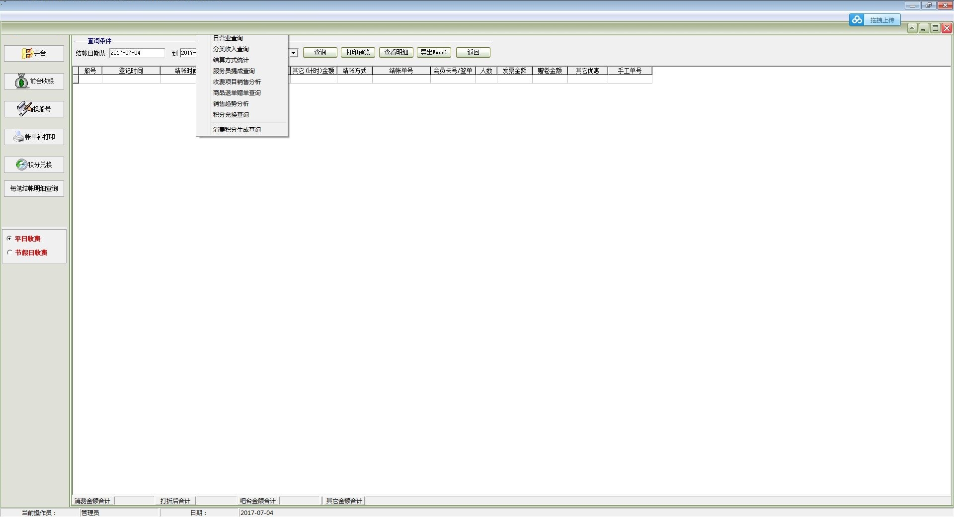 3、前台收银管理:开台管理,前台收银管理,合并船号,换船号,欠款补交,已结帐单置未结帐,帐单补打印,积分兑换。