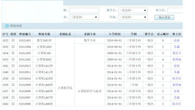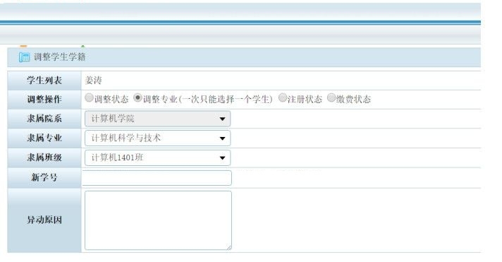 6、学籍调整:学生列表、调整操作、隶属院系、求属专业、求属班级、新学号