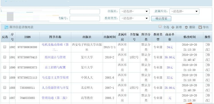 4、教材管理界面,学校新课本可以录入到这里,方便查看书籍明细