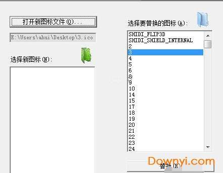 5、点击(上数第4个选项) "替换资源...",选择你要替换的图标(ico文件),点击左上角的"打开新图标文件(0)..."。