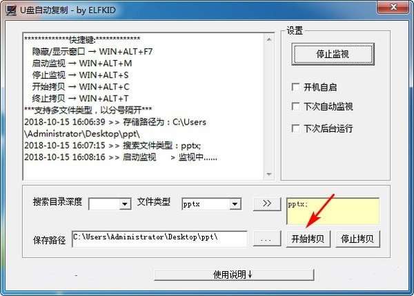 1、本软件可以监控u盘或移动硬盘插入或拔出。根据设定的文件保存路径自动将u盘或移动硬盘中的指定文件进行拷贝。