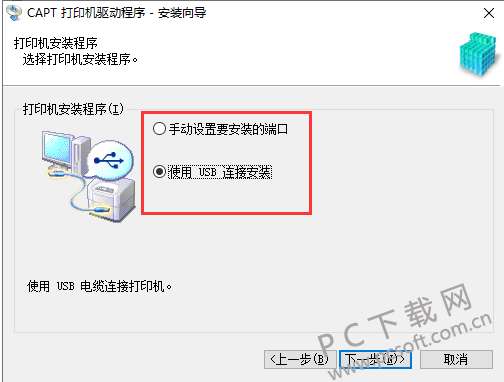 5、进入到lbp2900打印机驱动安装程序界面,我们有两种安装方式,一种是自己手动设置安装的端口,另一种是使用USB连接安装,小编为大家带来的是第二种,你也可以点击第一种选项进行安装。