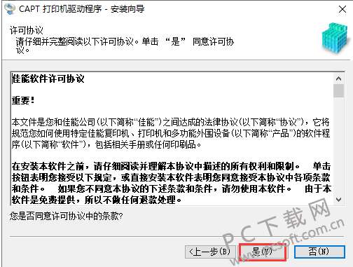 4、进入到佳能LBP2900打印机驱动使用协议界面,这里需要注意的是你只有点击下方的是选项同意协议,才可以继续安装,如果你不同意协议,那么驱动是无法安装的。