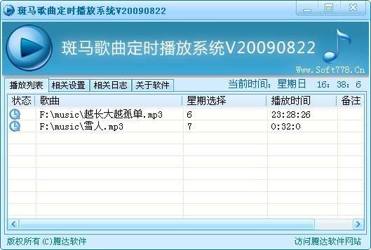 斑马定时歌曲播放是一款好用的歌曲定时播放软件,用户可以根据自己的需要设置播放列表,添加播放时间,定时开关机,还可显示歌曲名称、播放时间和星期参数,适合商场、超市、学校等。