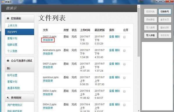 正常登录进账户以后默认看到自己上传过的文件列表,这里的界面和微演示官网基本一致。录音前需要先上传ppt文件。而且请注意选择"演示播放"模式。