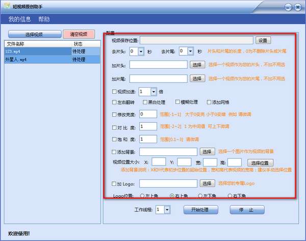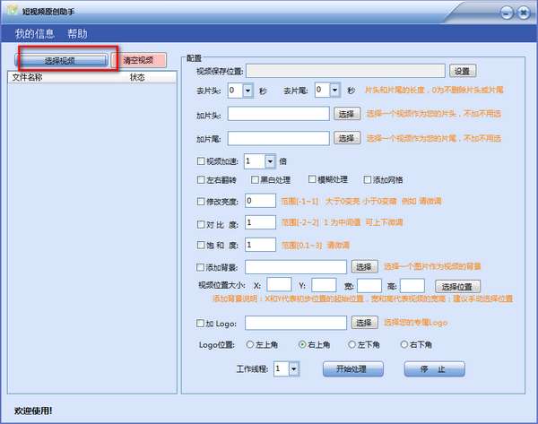 短视频原创助手最新版是一款简单易用的视频快速处理工具,短视频原创助手官方版能够将原有的视频进行一个快速的再处理从而使视频变成属于自己的原创视频,短视频原创助手最新版拥有视频调速,添加片头、修改视频颜色、添加自定义的视频背景、添加Logo等功能。