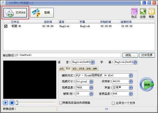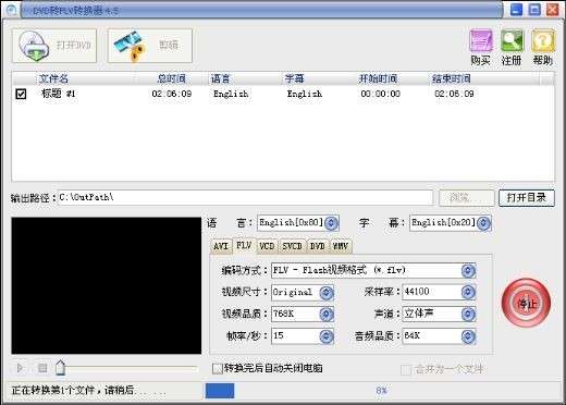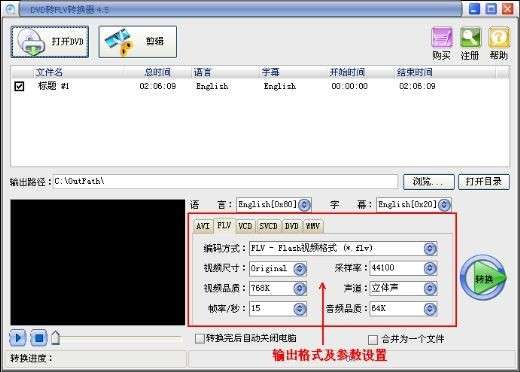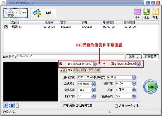 2、从DVD光盘中抓取转换所需的音频和字幕与DVD电影一起输出Flash的Flv,swf文件;