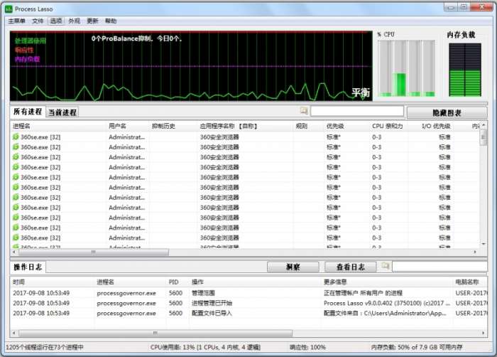 Process Lasso 是一款与众不同的调节等级的优化系统专用工具,关键作用是动态性调节每个过程的优先并设成有效的优先类以完成为系统软件减负增效的目地。此项特性被 Process Lasso 定义为过载抑制(out-of-control restraint),可有效避免蓝屏、假死、进程停止响应、进程占用 CPU 时间过多等症状。