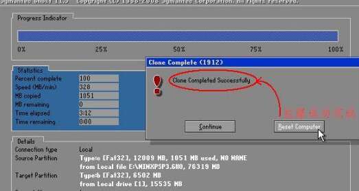 10、弹出成功完成对话框,点什么都行,此时系统已经恢复如初了。单击“Reset Computer”重新启动电脑,单击“Continue”(意为:继续)则回到Ghost的初始界面