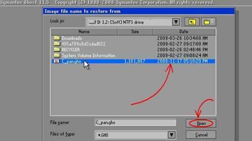 4、单击“某文件夹”(如备份文件存放在“某文件夹”内)内的*.gho文件,或用下光标键选好以后再单击“Open”按钮。如镜像文件有多个,请看准文件的生成日期,通常最靠后的比较好