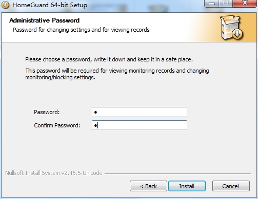 您可以为软件设置一个密码,在第一栏输入访问软件的密码,第二栏是重复输入,也可以直接点击install安装