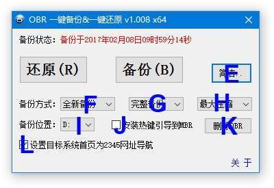 J、安装热键引导到MBR:安装快捷热键 Ctrl+F8到MBR,(仅限系统磁盘是MBR分区表时有效),可在开机后直接按Ctrl+F8进入备份还原环境;