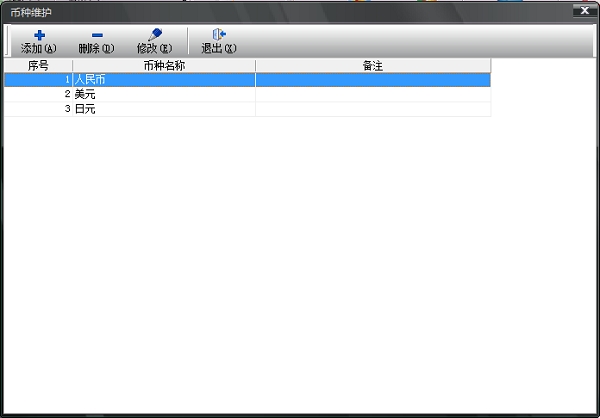 7、这里是货币的维护功能,该软件可以选择三种货币,支出人民币、美元、日元的维护,可以添加新的币种