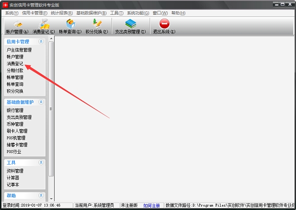 1、点击实创信用卡管理软件软件启动,这里试用版本是不需要密码的,点击登录