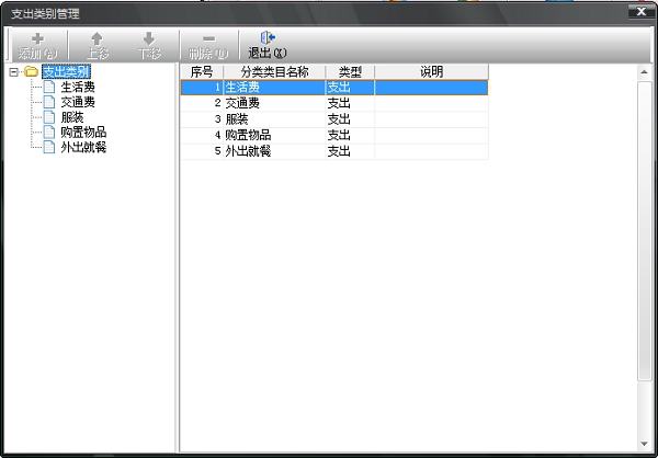 5、支出类别管理,可以查看分类类目名称、生活费、交通费、服装、购置物品、外出就餐等详细的支出数据