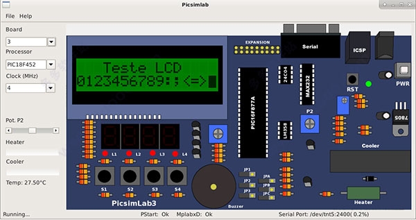 它模拟了Microgenius开发板PICGenios PIC18F e PIC16F Microchip,它使用一个PIC16F877A或一个PIC18F452