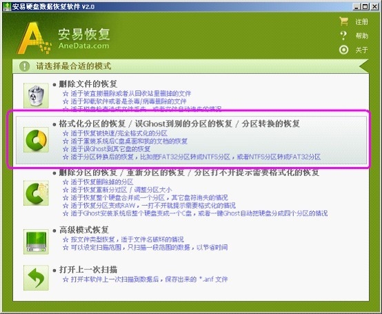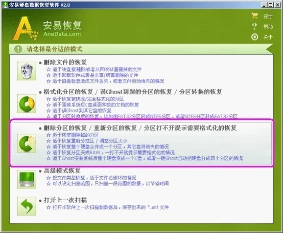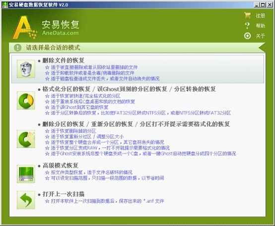 首先要选择数据扫描的模式。根据常见的文件丢失情况,提供了“删除文件的恢复”、“格式化分区的恢复/误Ghost到别的分区的恢复/分区转换的恢复”、“删除分区的恢复/重新分区的恢复/分区打不开提示需要格式化的恢复”和“高级模式恢复”以及“打开上一次扫描”等5个功能模块。