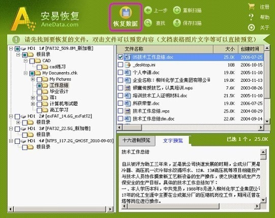 数据浏览界面。扫描完成后,能够列出扫描到的目录结构,具体的文件列表信息 预览数据功能。鼠标双击一个文件,就可以查看文件内容 查找文件功能