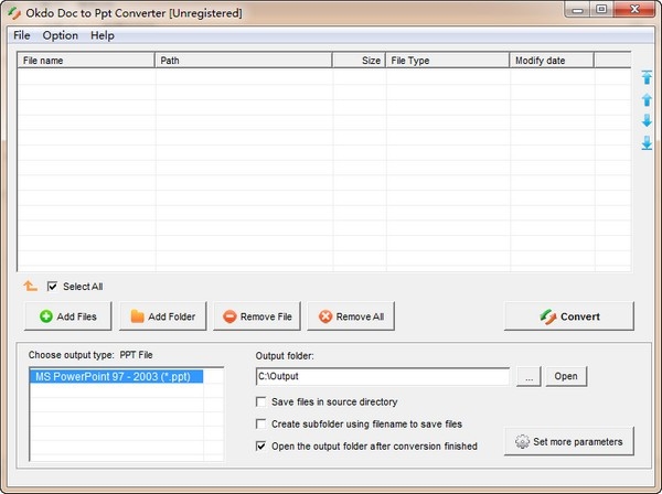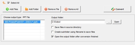 点击Add Files添加Excel文件,在OutPut folder中设置转换后保存的目录,然后选择转换的PPT格式,最后点击Convert即可开始转换。