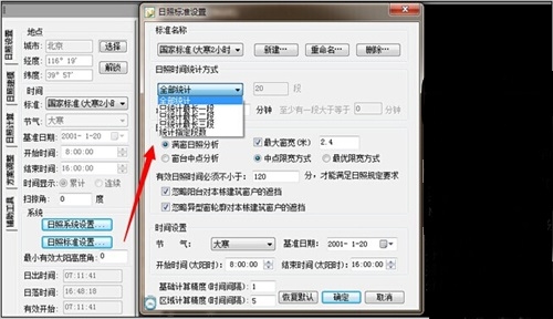 1、标准灵活:轻松设定日照标准,预设主要城市标准模版,选择城市名称自动获取经纬度,从结果标注可反查计算标准。