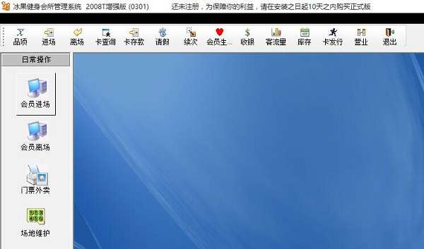 冰果健身会所管理系统最新版是一款健身会所经营管理软件。冰果健身会所管理系统最新版包含了品项管理、会员进场、会员离场、会员卡办理、会员卡充值、卡查询、卡存款、请假、生日提醒、收银管理、客流量查询以及库存管理等主要功能。冰果健身会所管理系统可以随时备份系统中的数据。