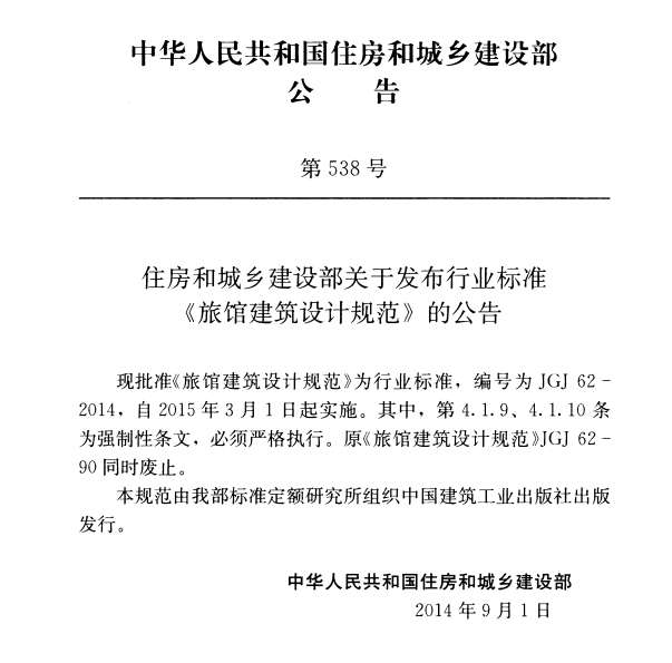 本规范修订的主要技术内容是:1.增加了术语和室内环境;2.取消了防火与疏散;3.将旅馆建筑等级改为由低至高划分为一、二、三、四、五级,并修订了相应条文;4.适应旅馆建筑使用、管理、技术方面发展的要求,对相关条文进行了修订。本规范中以黑体字标志的条文为强制性条文,必须严格执行。本规范由住房和城乡建设部负责管理和对强制性条文的解释,由中国建筑设计研究院负责具体技术内容的解释。