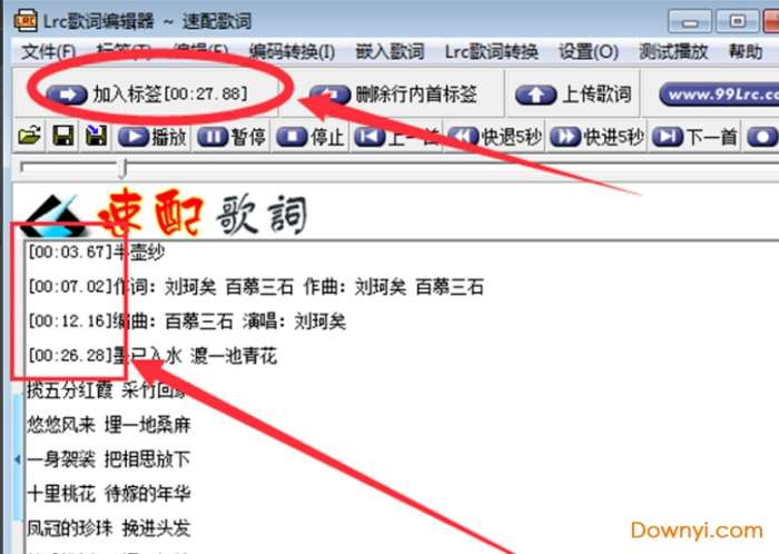 3、返回lrc歌词编辑器中将鼠标光标停到歌词前,等播放到想出现歌词的地方快速点击【加入标签】选项。