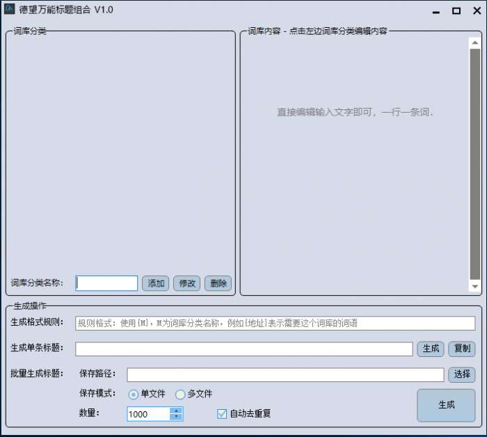 德望万能标题组合绿色版是款占用空间小的自动生成标题工具,德望万能标题组合最新版操作非常简单,主要可以针对关键词进行自动生成,德望万能标题组合只需要事先导入你所需要的关键词,软件会根据词库自动生成各种各样的组合,非常实用。