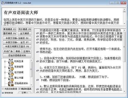 双语阅读大师是一款关于阅读的工具软件,具有文章阅读,背单词,TTS发音等多种学英语功能,使用有声双语阅读大师在网上浏览英文文章或中英双语的文章时可以随时朗读。
