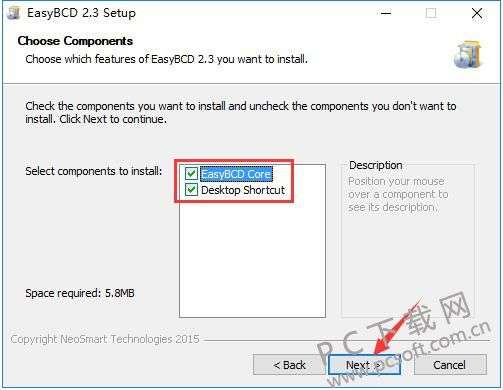 3、进入到EasyBCD软件安装组件选择界面,按照默认的选项就可以,直接点击界面下方的“next”。