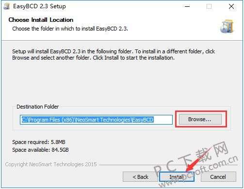 4、进入到EasyBCD安装位置选择界面,我们点击界面中的“Browse”选项,然后自行选择安装位置。选择完成后点击下方的“Install”开始安装。