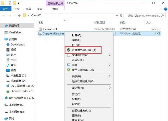 3、打开文件夹,在CopyAndReg.bat上单击右键,选择以管理员身份运行即可开始清理系统中旧版本VC的一些残留文件。