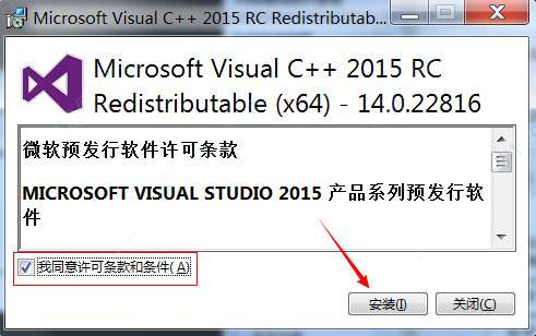 1、在PC下载网下载vc++2015运行库后,在电脑本地得到一个压缩包,解压后,双击.exe文件,勾选【我同意..】然后点击【安装】。