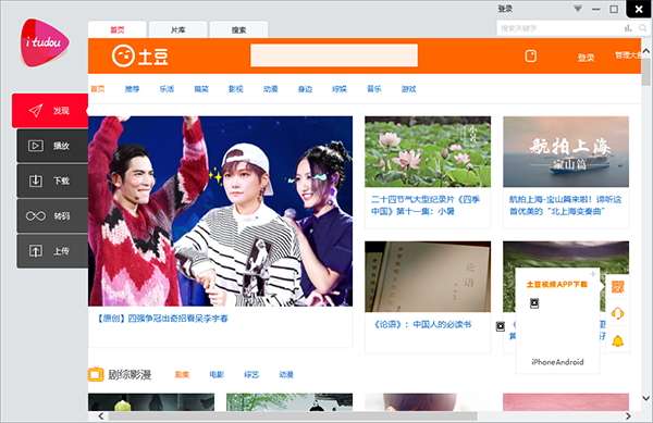 小编推荐:土豆网视频是一款功强大的视屏播放软件。土豆视频还可以用来在线观看视频、下载上传视频,将视频文件转换格式,放在各类多媒体上播放观看。本站还为您准备了爱奇艺影音,腾讯视频播放器等相关软件,欢迎前来下载。