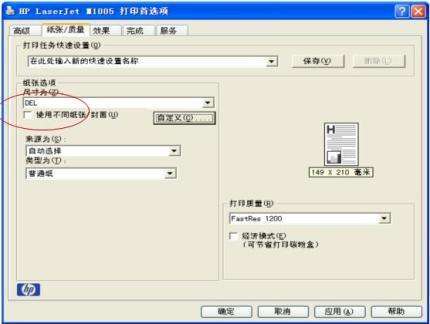 3、在打印首选项中选择纸张/质量下尺寸为自定义纸张,然后点确定;