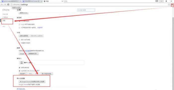 3、将谷歌浏览器设置为默认浏览器,点击浏览器右上角的三个横线标志,再点击左边菜单栏的【设置】,最后点击【将Google chrome 浏览器设置为默认浏览器】。