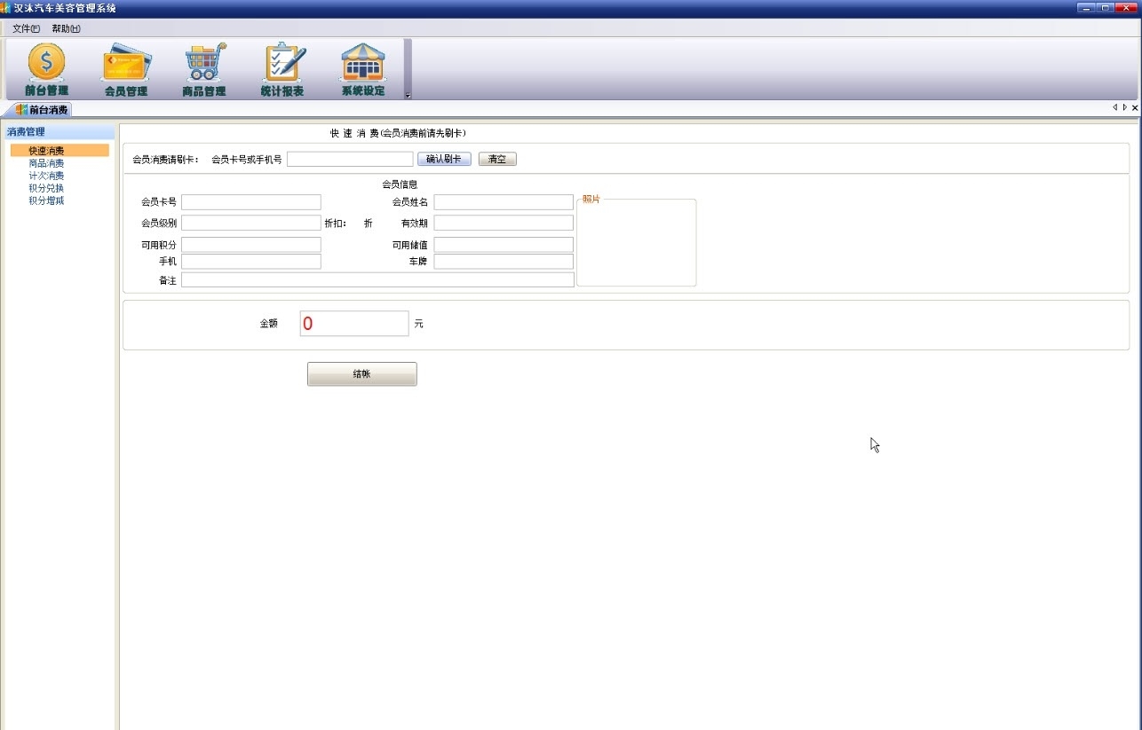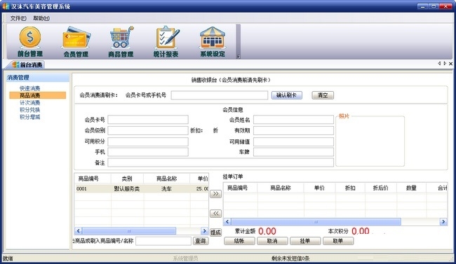会员消费:对会员消费情况进行录入,自动完成累计积分,消费打折。也可以增加会员消费商品的详细信息。