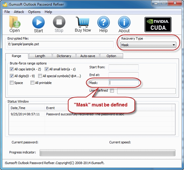 掩码:如果可以部分记住密码,则最好使用此类型恢复忘记的Outlook密码。如果您选择掩码类型,您应该提供一些您可以记住的密码符号。必须定义密码掩码才能使用掩码类型。它将减少密码恢复时间。