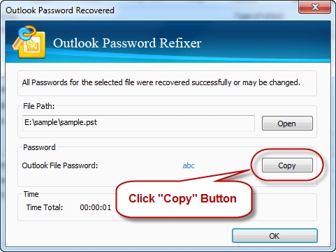 如果一切正常,Outlook.pst密码将很快恢复并显示在弹出对话框中。然后,您可以单击“复制”按钮并粘贴密码以打开受密码保护的Outlook.pst文件。