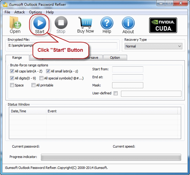 正常:此类型将尝试所有可能的密码组合以恢复丢失的Outlook密码。最好是你对丢失/忘记的密码一无所知。如果使用这种类型的恢复,只需单击“开始”按钮。
