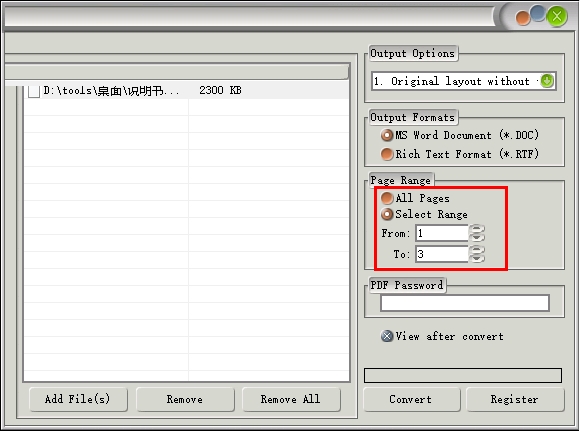 5、这里是转换页数设置功能,第一个是全部页数,第二个是自定义页数,例如1-3页