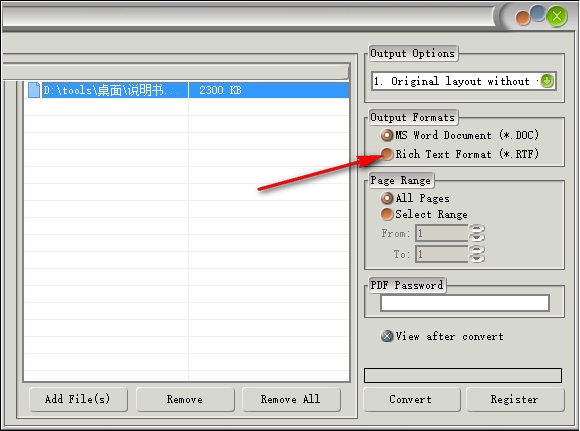 4、显示转换格式设置,这里支持doc以及rtf,默认第一个就可以了