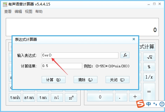 6、例如输入cos(60)点击计算,显示结果是0.5