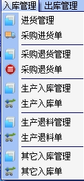 5.入库管理包括进货管理、采购进货单、采购退货管理、采购退货单、生产入库管理、生产入库单、生产退料管理等选项,如图: