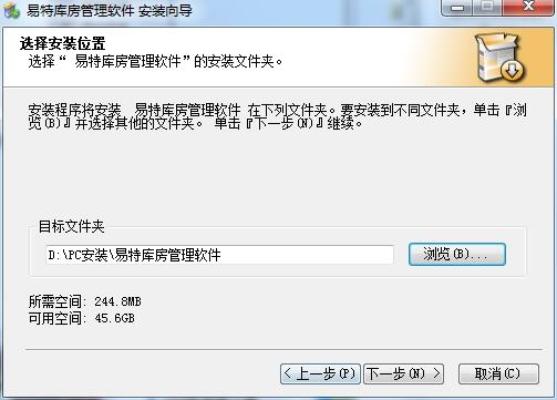 3.选择安装位置,系统默认的是D:易特软件易特库房管理软件,点击下一步,如图: