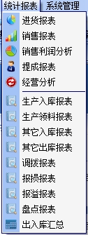 8.统计报表包括进货报表、销售报表、销售利润分析、提成报表、经营分析、生产入库报表、生产领料报表、调拨报表、报损报表、报溢报表、盘点报表等选项,如图: