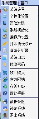 9.系统管理包括系统设置、个性化设置、短信发送、系统初始化、操作员设置、打印模板设计、查询分析器、系统日志、修改密码、数据备份、锁定系统等选项,如图: