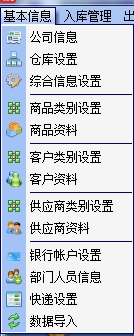 4.基本信息包括公司信息、仓库设置、综合信息设置、商品类别设置、商品资料、客户类别设置、客户资料、供应商类别设置、供应商资料、银行账户设置、部门人员信息、快递设置、数据导入等选项,如图: