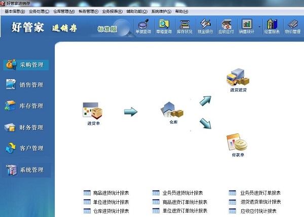 进货管理:采购入库、采购付款、采购退货、库存商品、库存统计、仓库信息、商品资料