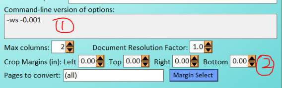 -ws 设置最低的词间距,大于该值自动换行,(为一个小写 ‘o’的高度的一部分)设置的值大了,就会使得更难将线分段, 如果是负, 表示打开自动词间距。自动间隔倾向于打破字母之间的长单词以产生符合屏幕显示的文本。 默认值= -0.20. 设置如果是负数,他的绝对值是一个最小允许的线分段值,如果你想要k2pdfopt积极打破行 (e.g. 如果他们不适合设备的行(宽度)的话就打破长单词),就使用一个更小的绝对值,例如:-ws -0.01. 上图的标注2. 主要是对设置切白边和要转换多少页等功能的设置,实际上现在可以不用了解,所以跳过。我会在后面的博问把命令行参数的解释放上来。